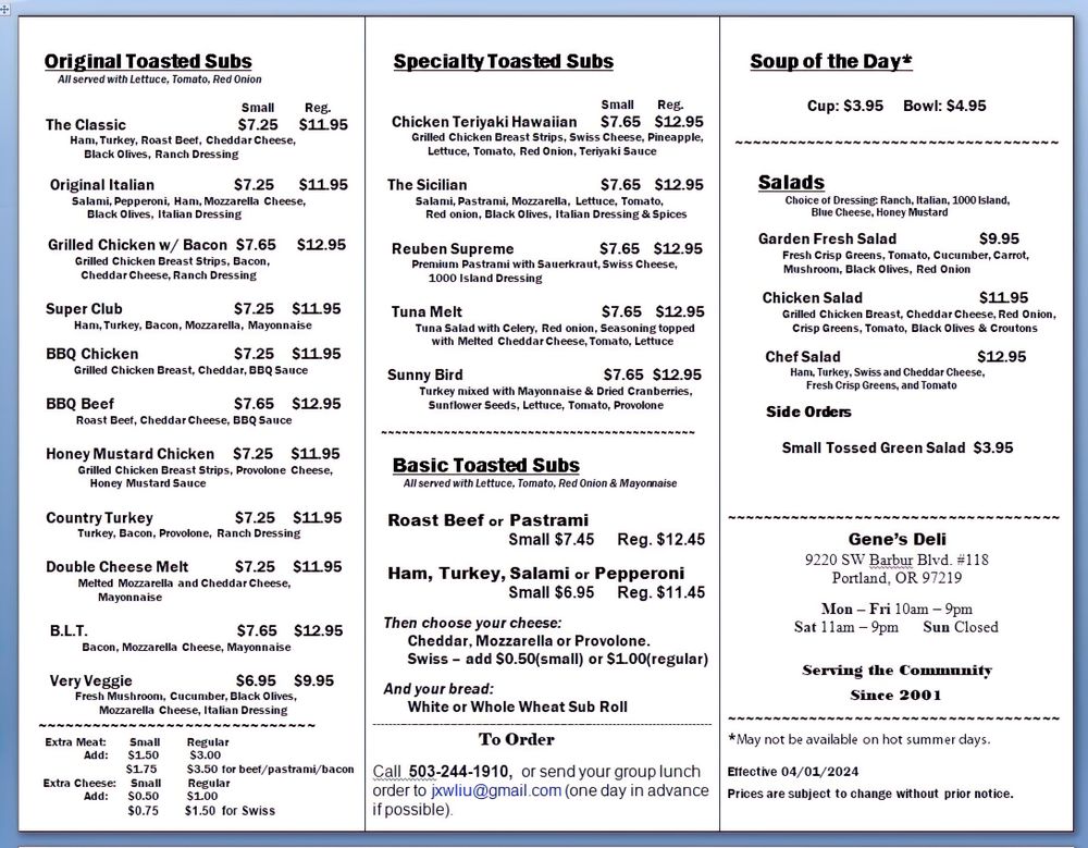 Welcome to Gene's Deli, Portland's hidden gem nestled on SW Barbur Blvd, where delicious sandwiches steal the spotlight. The menu features a variety of original toasted subs, designed for flavor enthusiasts. Highlights include the Country Turkey, packed with turkey, bacon, and provolone, and the flavorful Original Italian, brimming with salami and pepperoni. Each sandwich, served on choice of whole wheat or white bread, balances fresh ingredients like lettuce, tomato, and onion flawlessly.